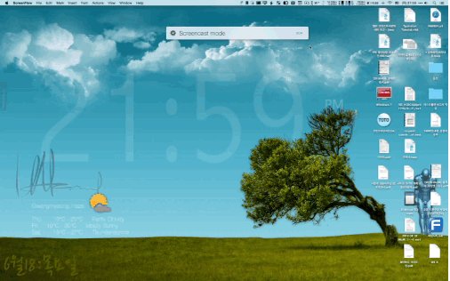 만약 위와 같은 경우가 발생했을경우, 여러분들은 어떻게 하시겠습니까? 바탕화면에 임의의 폴더를 만든 후, 널려있는 각종 자료를 폴더에 그냥 쓸어담을 것입니다. 그리곤 컴퓨터 설정을 통해 바탕화면을 변경하실것 입니다. 그런데, 바탕화면에 Geektool과 같은 화면요소들을 설정했다고 한다면 그 마저도 쉽지 않습니다. 아마도 그럴상황이 발생하면, 대부분은 자신이 나중에 후회할지라도 지금의 상황을 모면하기 위해 Geektool 설정을 지우고 화면을 깨끗이 할 것입니다.