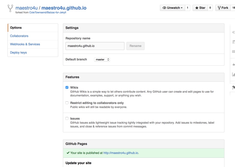 - Fork된 사이트의 이름을 자신이 등록한 이름과 동일한 이름으로 바꾸되. 뒤에 github.io를 추가합니다. 제 경우를 예를들면, 등록시 아이디가 maestro4u 이기때문에 Fork한 사이트 이름을 masetro4u.github.io 으로 바꿉니다. 제가 사용하는 테마는 http://github.com/mmistakes/hpstr-jekyll-theme를 Fork하여 사용중입니다.